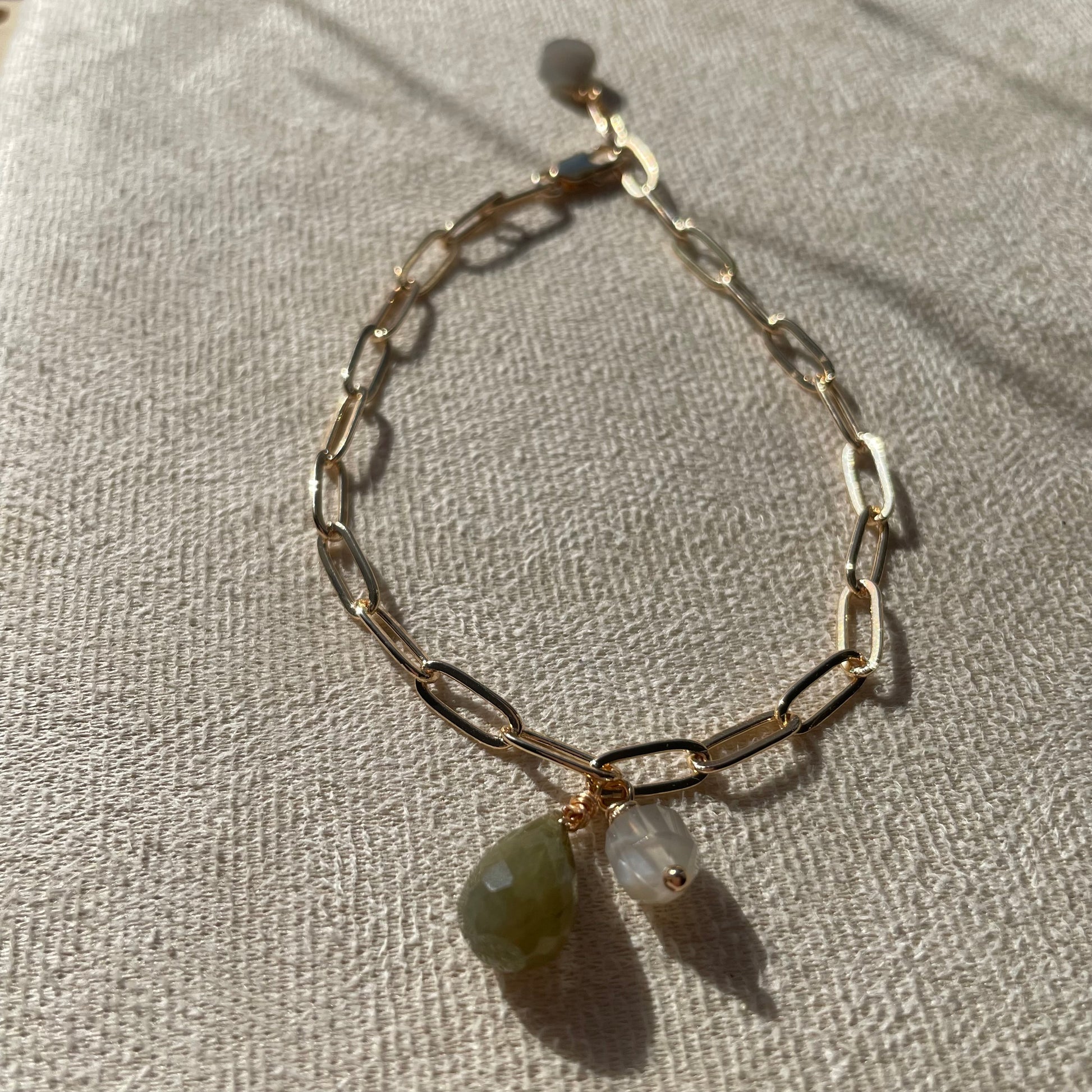 Elevate your style with our stunning gold bracelet featuring a dazzling faceted rutile quartz briolette & peach moonstone beads.