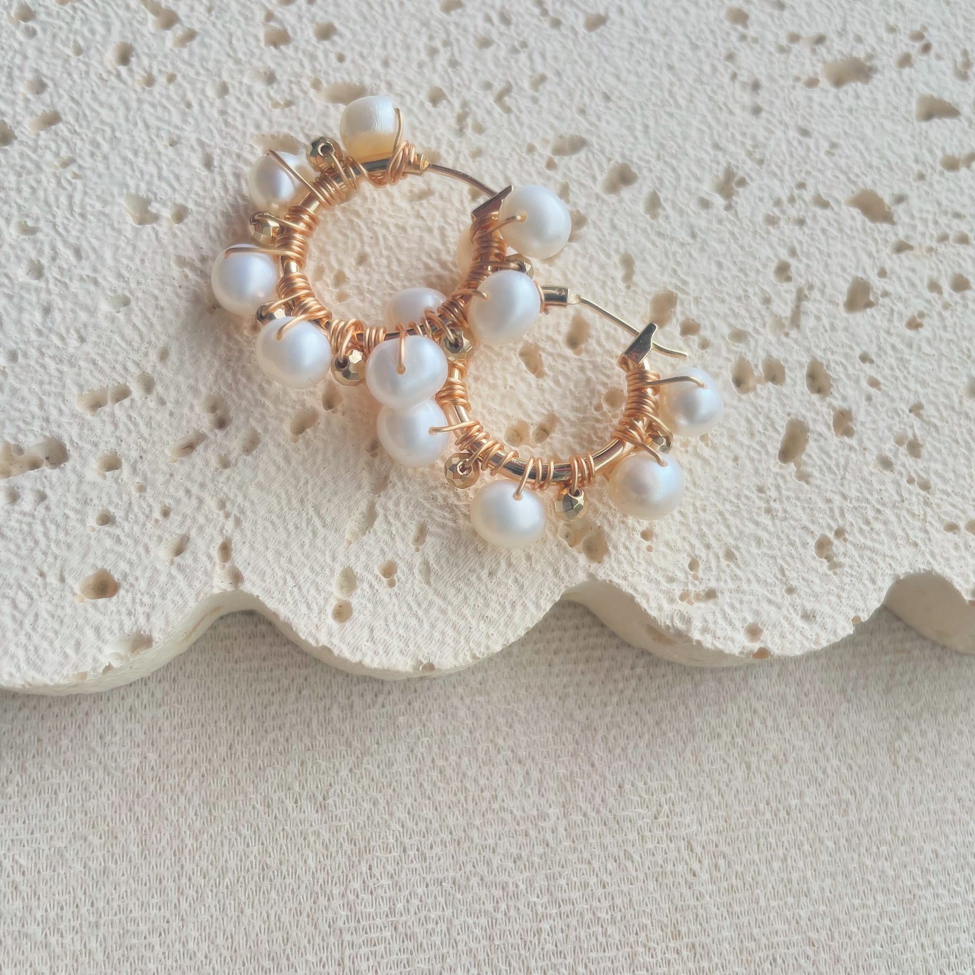 Wired hoop earrings with freshwater pearls and faceted gold hematite beads.